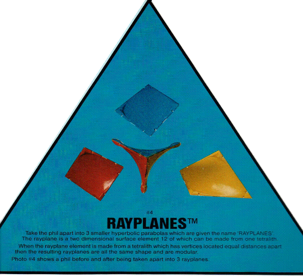 Around 300 B.C. the Greek mathematician Euclid is said to have taught and founded a school at Alexandria. His book the 'Elements' along with later books written by Archimedes defined and laid the foundation of modern geometry. Both the hyperbolic and the parabolic shapes were defined but apparently the combined shape of the hyperbolic paraboloid was not addressed in a manner that recognized that the surface of a warped plane generated from straight line elements can define the vertices or points of a tetrahedron. Or two pairs of opposite edges of any shaped tetrahedron, regular or otherwise can be used to generate a hyperbolic paraboloid. Photo #1 is models of hyperbolic paraboloids. Their shape is made up of straight line elements. These particular hyperbolic paraboloids have vertices which are located equal distance apart and their edges are equal in length. The mind of the human individual is shaped by each individual's experiences. We call the summation of these experiences reality. Jonathan Swift and Lewis Carroll in their classics "Gulliver's Travels" and "Alice in Wonderland" describe realities which are different than the reality of a contemporary individual schooled in the tradition of western reasoning. By thinking back into history, back before Isaac Newton, Euclid, Plato, Socrates, and Pythagoras, back in time before man had made his first six-sided stone monolith or brick out of mud we can imagine what might have taken place. By taking a handful of mud, shaping it into a ball and flattening the ball in a special way one could make the ball of mud six-sided, put it into the sun to dry and call this cubic object a brick. With this object one could build an arch and later a dome. Since that time our ancestors have made many arches and domes, and this six-sided 'View' has produced the reality that we live in today: Ours is a reality of up or down, top or bottom, front or back, left or right, right or wrong, black or white, a neat little reality all held together by the force of gravity. Today, as we go into space, we enter a realm where our arches and domes fly apart. We do not have gravity as a bonding agent in space as we do on earth. What would our reality be and what would the tools of reasoning be like if our ancestors had decided to make their mud balls, or carved their stones not into a six-sided object but into a simpler four-sided object? It appears that when nature started evolving life forms, she picked the simpler four- sided configuration built around the carbon molecule. It is possible that if our ancestors had chosen the four-sided tetrahedron instead of the six-sided cube, our view of modern reality might have evolved with a 'Different View.' Even our tools of reasoning would have been different. Would we still have a base 10 number system where we square or cube a number instead of triangle or tetrahedron it? Would we be as comfortable with 90 degree or right angle construction which is so rarely used in nature, or even more rarely used within the organic realm? R. Buckminster Fuller takes a 'Different View' in his books, "Synergetics I and II". He explores reality in a four-sided way, but even Fuller uses western logic based around a system of mass where the basic building blocks of reality are constructed of spherical atoms. Once more think back into time, and instead of making bricks, let's look at another ancient skill, the skill of weaving and basket making. Actually, as we venture out into space, this ancient art form has applications more appropriate than brick making. In fact modern man has been so, busy making bricks, arches, domes, and tin-can space stations that we have neglected weaving and its tensile design potential. Weave a flat matt out of sticks, straight sticks, and interlace them together so we have four edges and four vertices. The angles that the edges form at the vertices will add up to 360 degrees if all of the edges lie in the same plane. Let us take a 'Different View' and weave our straight sticks together in a manner where the edges are in different planes. Now measure the angles that the sides form and they add up to less than 360 degrees. We have formed a hyperbolic paraboloid. Let us call it an HP for short. Look at the surface of the HP and you can see that it curves two ways at the same time and it is still made up of straight line elements. Now let us get fancy with our weaving and invent a way to weave three HPs together in a manner where each HP shares two sides in common; this will form an object which has six edges and four vertices like a tetrahedron. Since this object does not have flat faces we will name this invention a TETRALITH. |