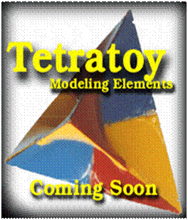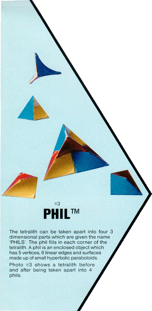 Merge three hyperbolic paraboloids in a manner where they have a common midpoint and together they make up a three dimensional solid which is given the name, TETRALITH. The tetralith has four vertices and six edges like a tetrahedron. It is a three dimensional object made up of straight line segments like the tetrahedron, but its faces are made up of three small hyperbolic paraboloid planes which converge at a common midpoint. Photo #2 pictures three separate hyperbolic paraboloids before they are merged and a tetralith which has been assembled by merging three hyperbolic paraboloids. |