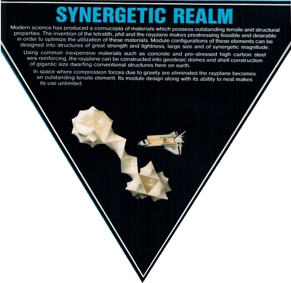 While we are inventing and labeling, let us invent one more thing. Let us weave six HPs together where they all have a common mid-point. Now we have invented an object which we will call an OCTALITH. The OCTALITH is made up of eight PHILS or twenty-four RAYPLANES. Actually, we are right back to where we started, because the OCTALITH which we have invented has eight vertices just like the six-sided brick. Or if we take a 'Different View', it may be possible to describe reality, not only Newtonianly and with Einstein's E=MC˛ but also with a system of reasoning based around synergetic force-fields. It could be that, instead of thinking atoms, bricks and entropy, we can intellectually weave a synergetic tensile reality which will help us become more oriented as we step out of Mother Earth's mud and into the realm of space. |